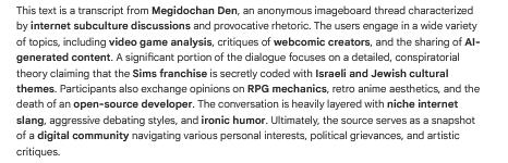 It's also unable to put the pieces together that the literal Neo Nazi is the same person complaining about Jewish Sims while CARING A LOTâą about Ukraine and that the irritation isn't at the base text so much as the aggregate. I asked it what politsperging is and it can pin it so hopefully it gets smart enough to realize mucho text isn't all that important and puts it in a corner instead of making it a focus because we're TOXIC. That's all I hope for with this exercise in futility.