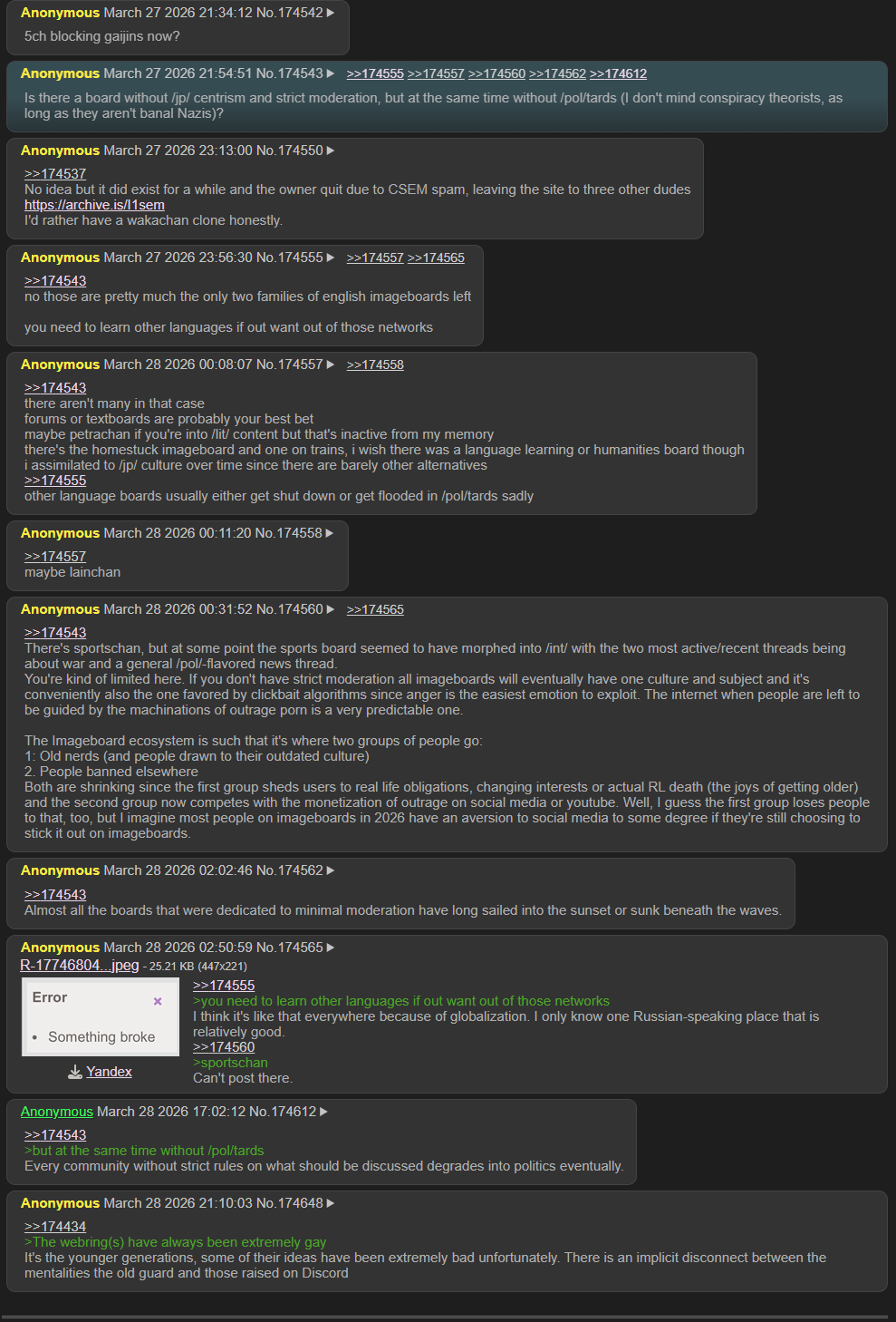 >>13379>What the smurf were you guys on yesterday?For me it was nihilism. Real hands off the steering wheel stuff