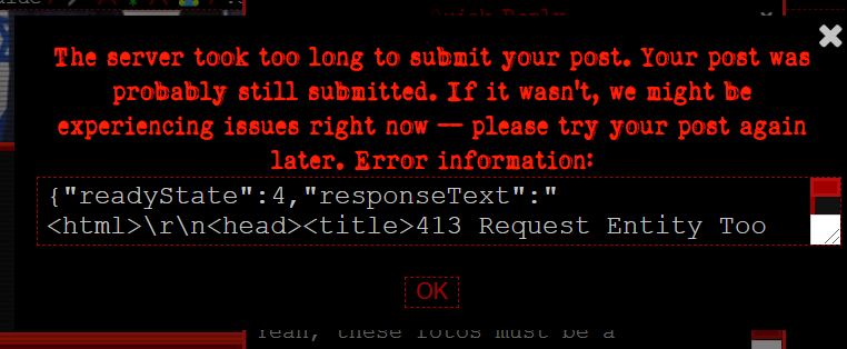 {"readyState":4,"responseText":"<html>\r\n<head><title>413 Request Entity Too Large</title></head>\r\n<body>\r\n<center><h1>413 Request Entity Too Large</h1></center>\r\n<hr><center>nginx/1.22.1</center>\r\n</body>\r\n</html>\r\n<!– a padding to disable MSIE and Chrome friendly error page →\r\n<!– a padding to disable MSIE and Chrome friendly error page →\r\n<!– a padding to disable MSIE and Chrome friendly error page →\r\n<!– a padding to disable MSIE and Chrome friendly error page →\r\n<!– a padding to disable MSIE and Chrome friendly error page →\r\n<!– a padding to disable MSIE and Chrome friendly error page →\r\n","status":413,"statusText":"error"}